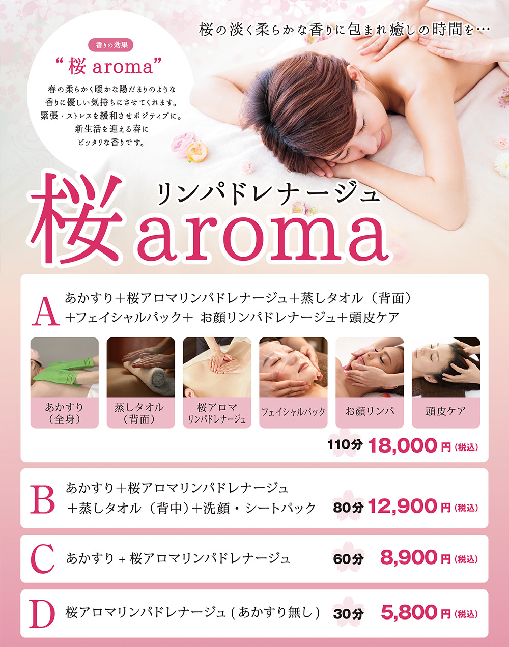 2026年2月28日 / 最終更新日時 : 2026年2月28日 燈台Web管理者 あかすり屋 横浜みなとみらい店 [あかすり屋みなとみらい店]桜の淡く柔らかな香りに包まれ癒しの時間を 桜aroma香りの効果 春の柔らかく暖かな陽だまりのような香りに優しい気持ちにさせてくれます。緊張・ストレスを緩和させポジティブに。新生活を迎える春にピッタリな香りです。 キャンペーンメニュー あかすり屋 横浜みなとみらい万葉倶楽部店